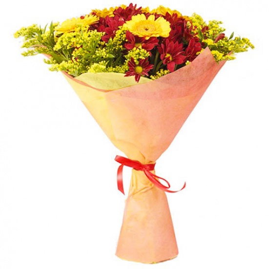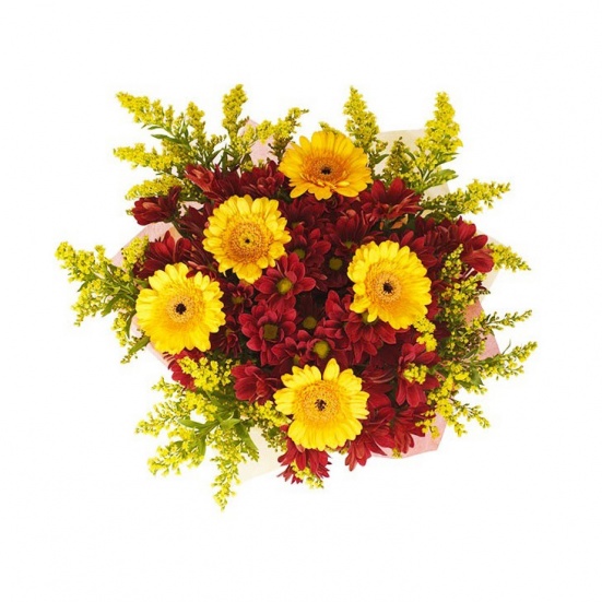 Букет «5 гербер, 5 хризантем, 5 солидаго»