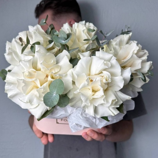 Композиция из белых французских роз и эвкалипта в Кингисеппе